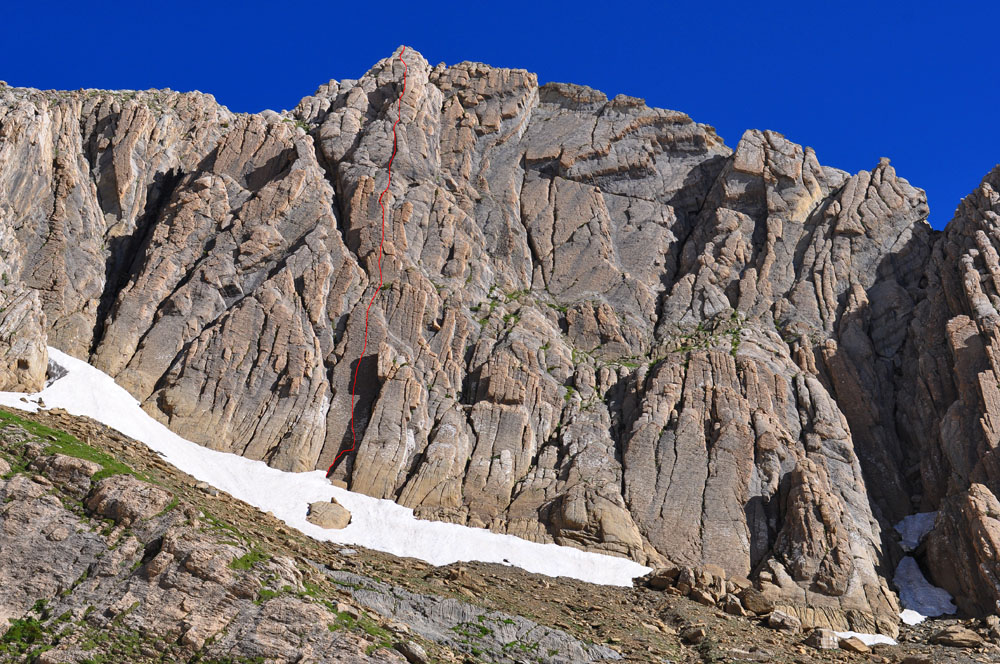 El objetivo era el bonito Pic de Sarradets por la superclásica voie directe. Esta es una importante variante a la vía clásica y supera el mismo tramo de pared pero de forma recta y por el mejor terreno. Bastante equipada con spit constituye una ascensión sumamente bonita y recomendable tanto por el lugar como por la calidad de la roca y sus dificultades razonables y homogéneas. Aunque siempre le podremos achacar falta de continuidad, hecho típico del resto de los Pirineos, que le vamos a hacer…