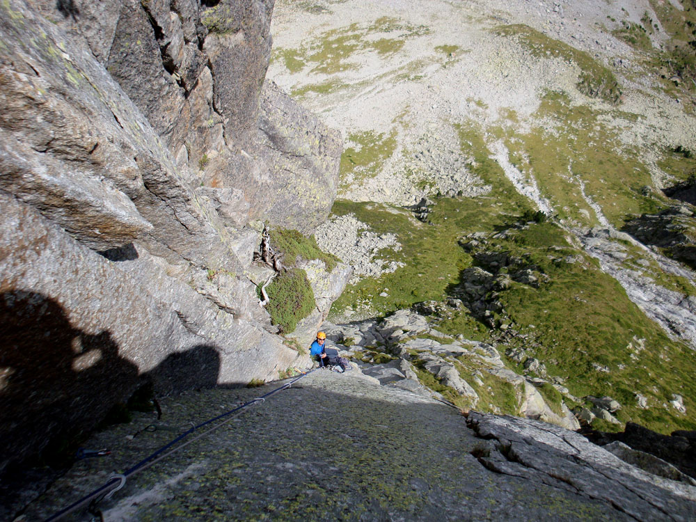 Le toco a él resolver este largo y se lo pasó bomba colocando en todo momento friends a cañón, uno tras otro, de manera que no hizo falta poner ni una sola chapa en toda la tirada. Montamos la reunión final y lo que sería el descenso normal por la cara este, reforzando de paso la instalación de una sola chapa con otra más.