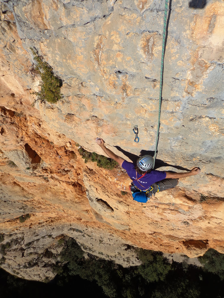 Por el momento únicamente existe una vía abierta por escaladores catalanes en la pared de enfrente y otra en el Cingle, propiamente dicho: la Despertaferro, que es la única opción equipada del lugar. Y a ella fuimos.
