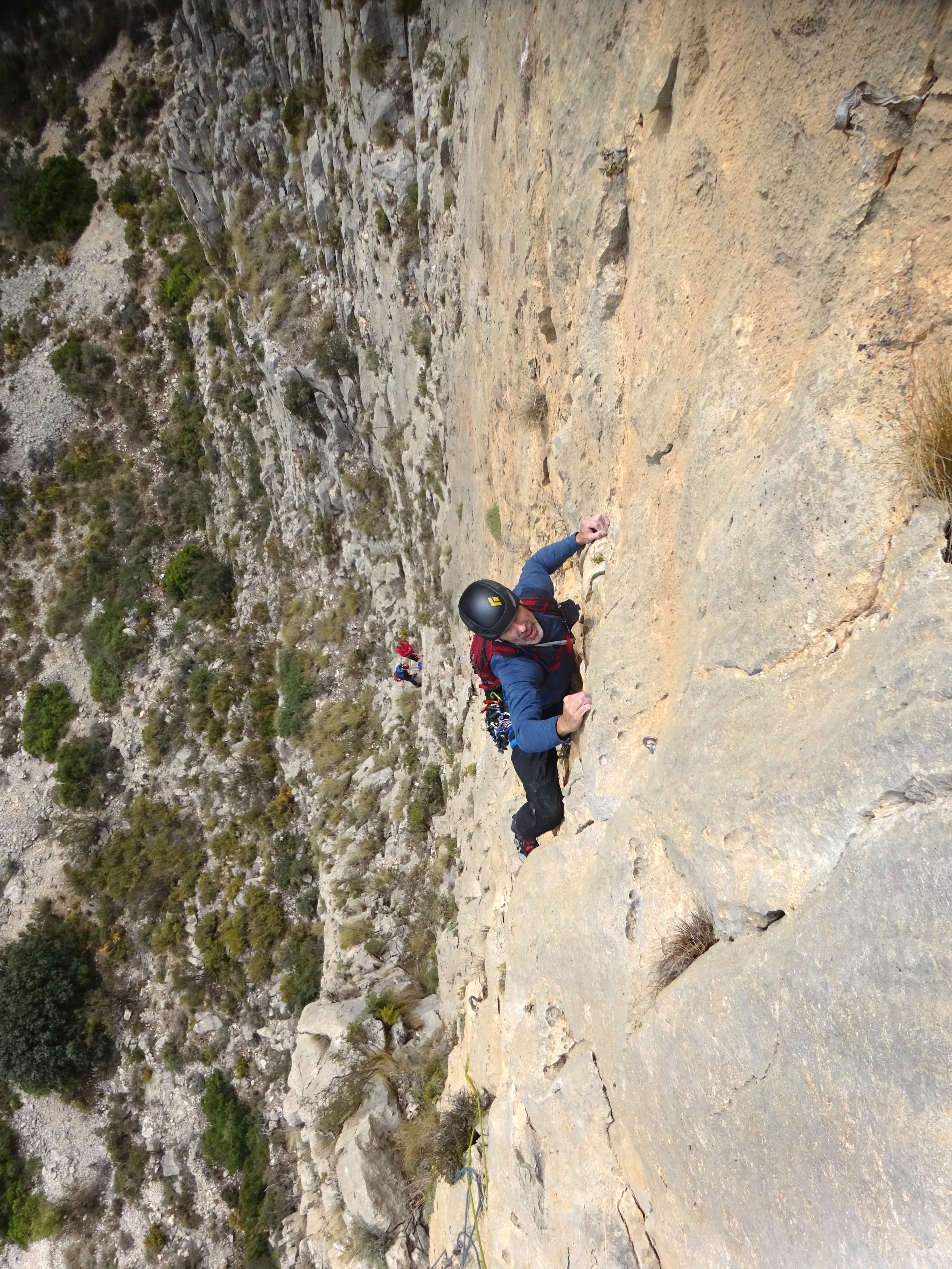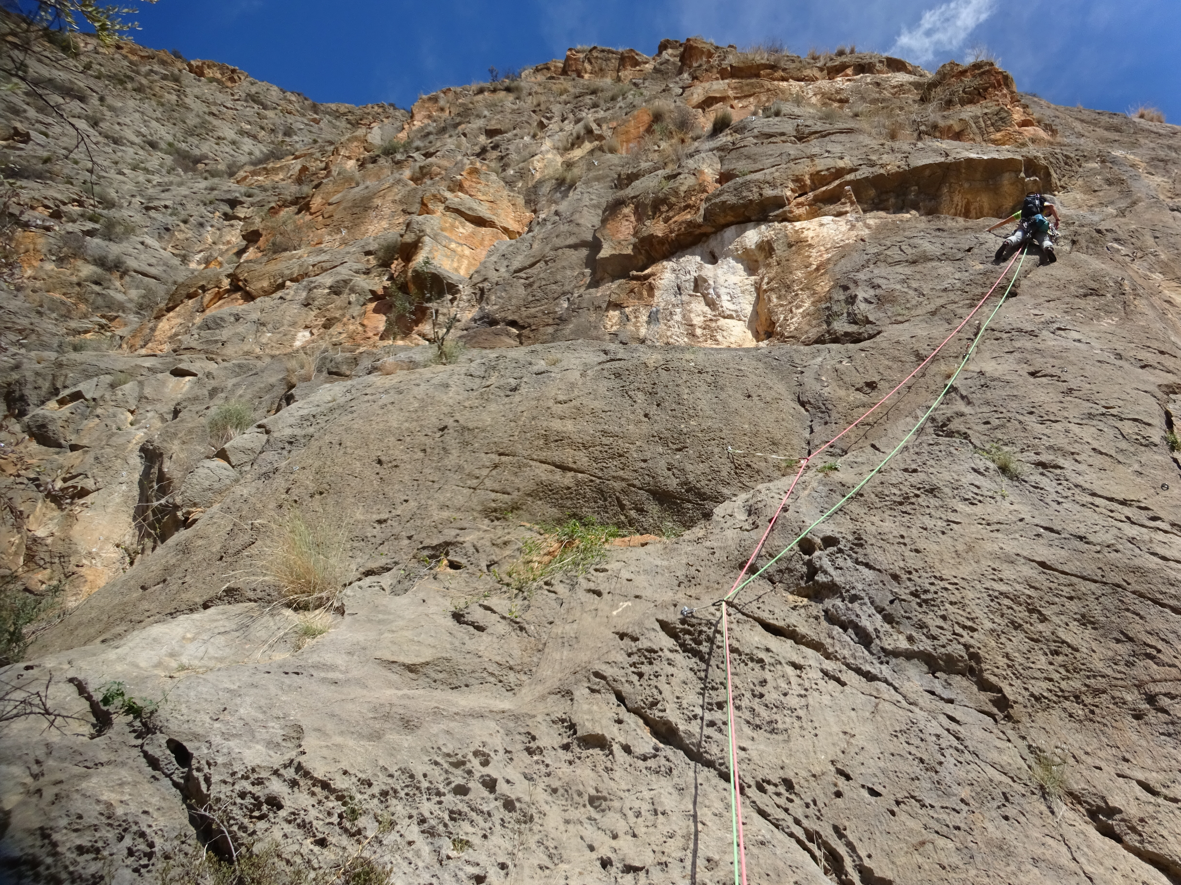 Prefiero pasar calor que el frío de ayer. Como ambos tenemos que acabar a una hora razonable, esta vía parece que se ajusta bien a las necesidades. No muy difícil pero bastante a equipar. Roca excelente y bonita escalada.